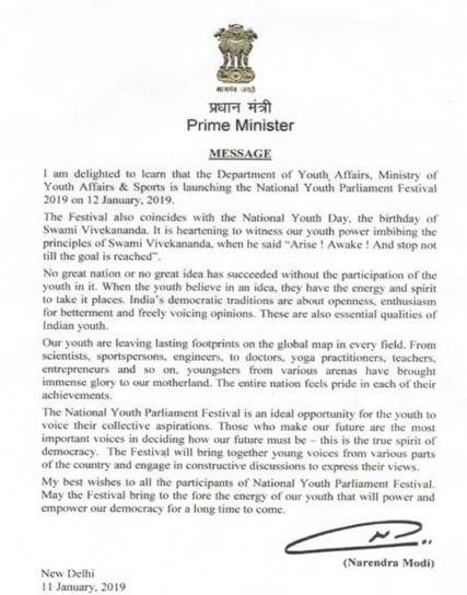 The process is being initiated with effect from today, the 12th of January 2019 and will continue up to 24th February 2019. The National Service Scheme and Nehru Yuva Kendra Sangthan organizations will remain involved at different levels in its conduct and management. The best three speakers at the National Youth Parliament will be awarded Rs. 2 Lakhs, Rs. 1.50 Lakhs and Rs. 1 Lakh respectively by the Prime Minister.